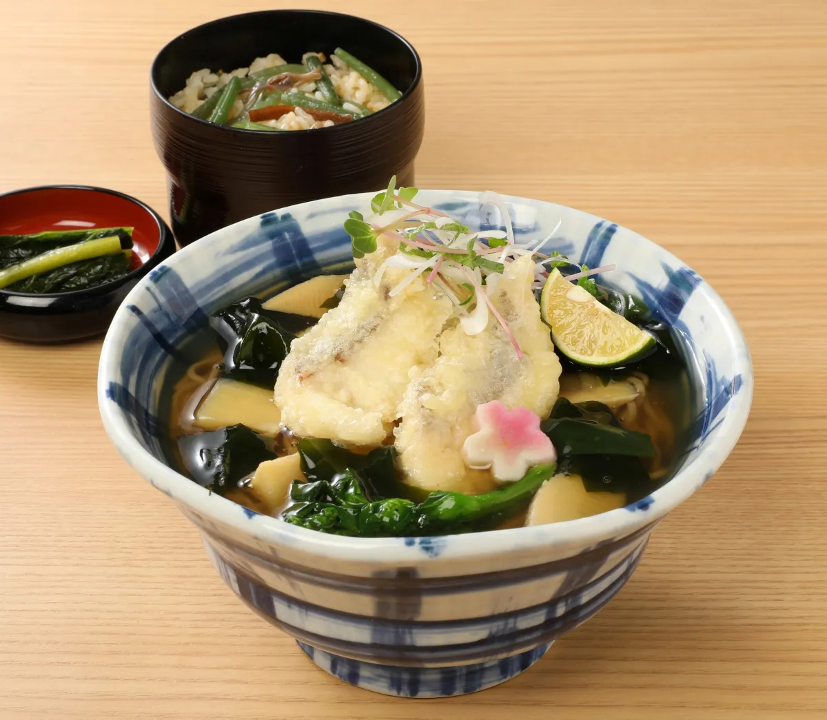 この定食は、筍、鳴門わかめ、菜の花を贅沢に使ったあんかけそばに、ふっくらと揚げられた天然真鯛の天ぷらがトッピング。山菜かやくご飯も一緒に楽しめるセット内容で、価格は1,340円(税込)です。この組み合わせは、春の味覚がしっかりと詰まった晩餐を提供し、心まで温まるひとときを演出します。