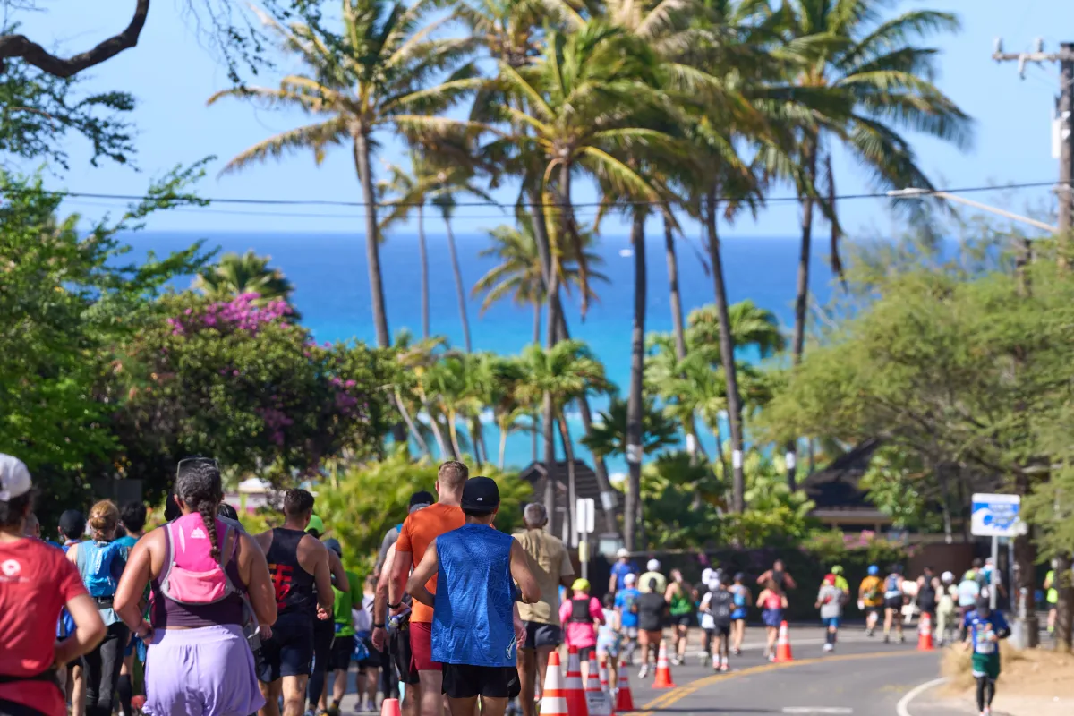 参加人数は制限がなく、昨年は多くのランナーが参加しました。フルマラソンでは約23,000人、10Kラン&ウォークでは約9,000人の参加がありました。フルマラソンコースは、アラモアナ公園をスタートし、ワイキキビーチやダイヤモンドヘッドを通り抜けて、カピオラニ公園でフィニッシュする美しい景観が望める平坦なコースです。