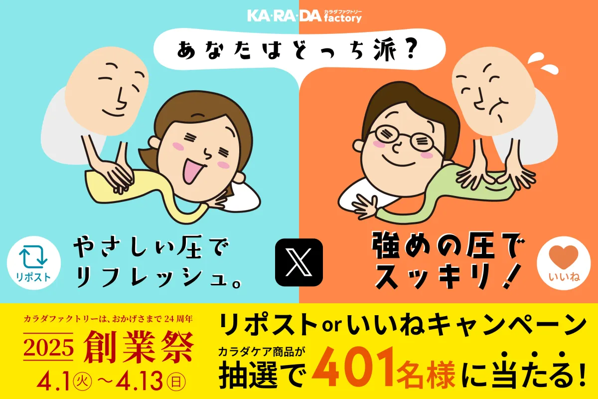 整体×骨盤サロン「カラダファクトリー」を展開する株式会社ファクトリージャパングループは、2025年4月1日から創業祭を開催します。本キャンペーンは『あなたはどっち派?リポストorいいねキャンペーン』というもので、日頃のご愛顧に心より感謝の意を込めた特別なイベントです。