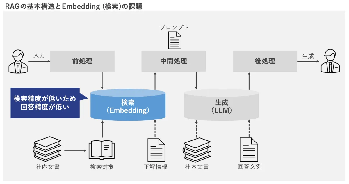 その主な理由の一つとして、RAGに必要なEmbedding技術が日本語モデルにおいて不十分であることが挙げられます。多くの企業は、精度が低いEmbeddingモデルを使用し、結果として生成される情報の精度が損なわれるという問題を抱えています。これによって、日本企業のAI技術活用が制約されています。