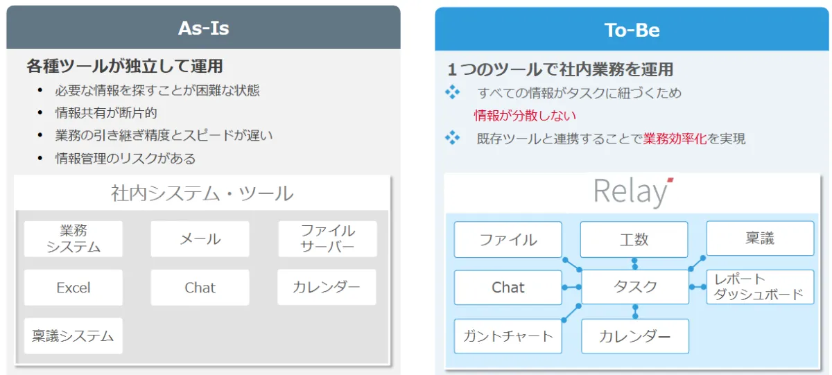 企業における業務や情報は、Excelやメール、ファイルサーバー、様々な社内ツールに分散されていることが多く、そのため進捗管理や工数把握、情報共有において多くの課題に直面しています。この分散状態は経営判断の遅延や業務の属人化、情報漏洩のリスクを招く要因となります。Relayはこうした問題を解消し、業務プロセスを一つのプラットフォームで可視化するために開発されました。このツールを活用することにより、企業全体の生産性と透明性が大幅に改善されることが期待されています。