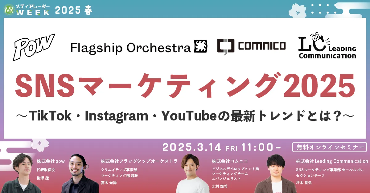2025年3月14日(金)に、株式会社アイズが主催するオンラインセミナー「第17回メディアレーダーWEEK 2025 春」が開催されます。本セミナーは、SNSマーケティングの最前線を学ぶ絶好の機会であり、視聴は無料です。経験豊富なマーケティング専門家たちが一堂に会し、最新トレンドや成功事例を共有します。参加希望者は、先着200名までの受け付けですので、早めに申し込みをお勧めします。