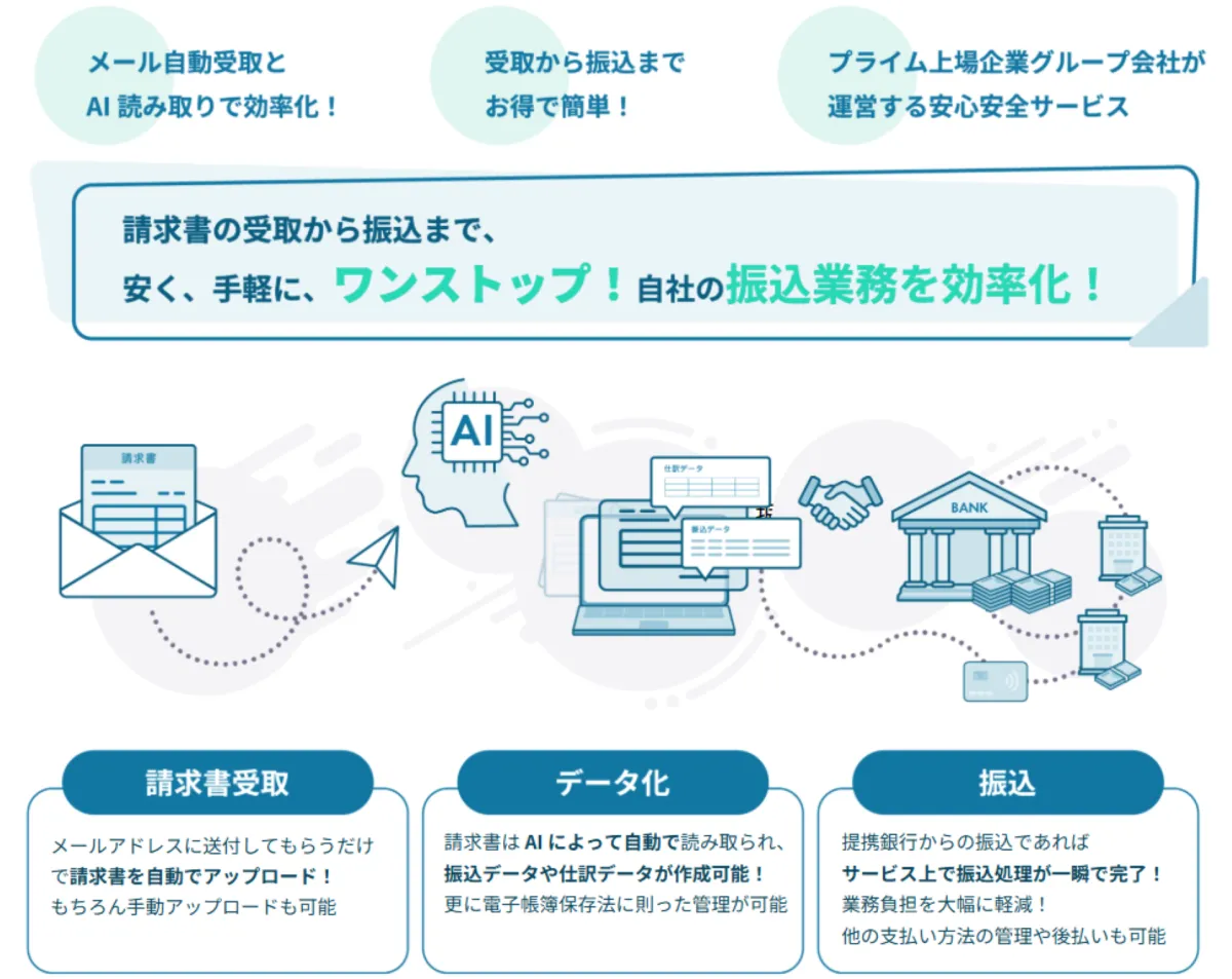 ワンストップ処理: 専用メールアドレスへ請求書を送信するだけで、AIが自動で処理し振込まで完結。