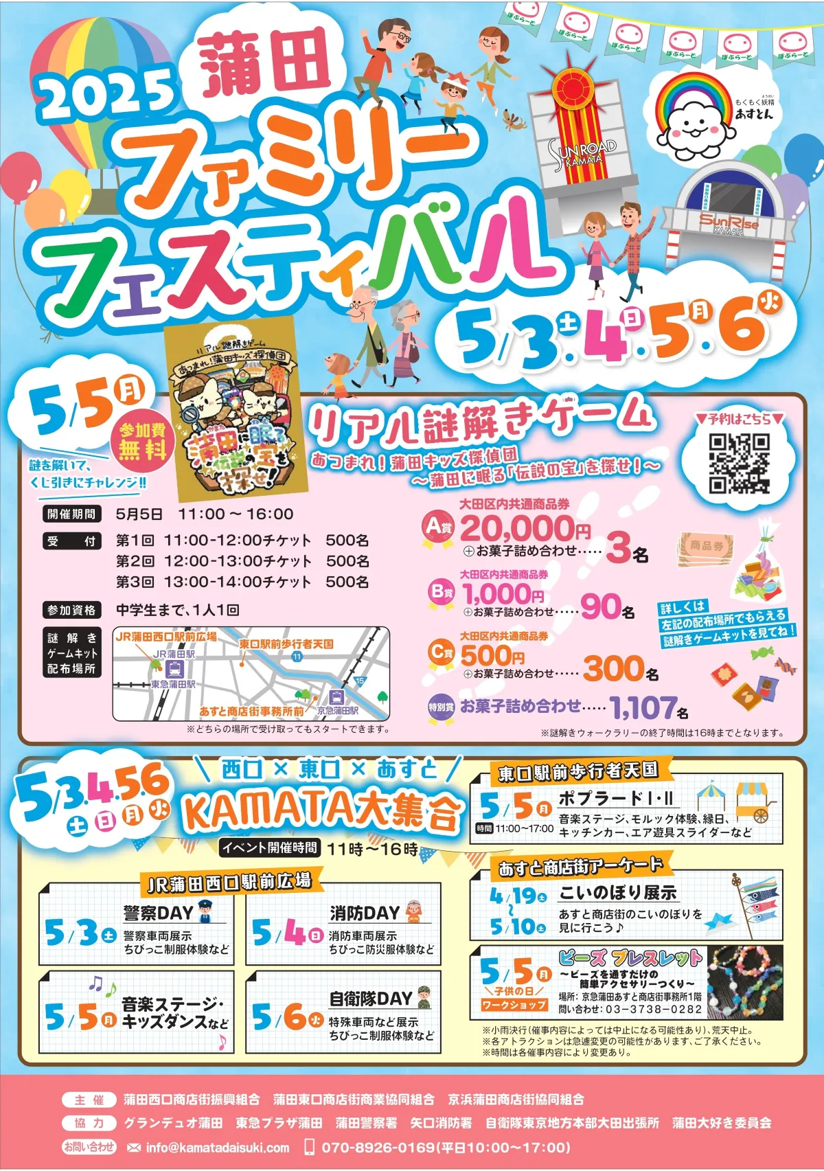 特に注目は、5月5日に行われる「リアル謎解きゲーム」です。このイベントでは「蒲田に眠る『伝説の宝』を探せ!」というテーマのもと、参加者が蒲田駅周辺に隠された謎を解き合言葉を導き出します。正解をゴール地点に伝えると、豪華商品が当たるくじ引きが待っています。参加対象は中学生以下で、1人1回参加可能です。事前予約が必要で、最大1,500名まで参加できるため、早めの申し込みをおすすめします。
