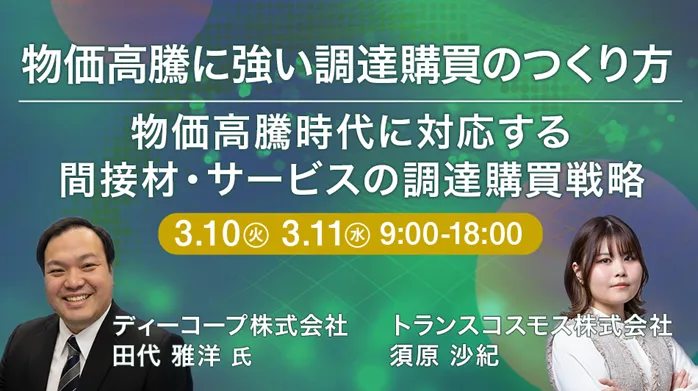トランスコスモス株式会社は、2026年3月10日と3月11日に「物価高騰に強い調達購買のつくり方」と題したオンラインセミナーを開催します。このセミナーは、現在の厳しい経済環境において、企業がどのように調達購買の戦略を見直し、最適化を図るべきかに焦点をあてた内容となっています。