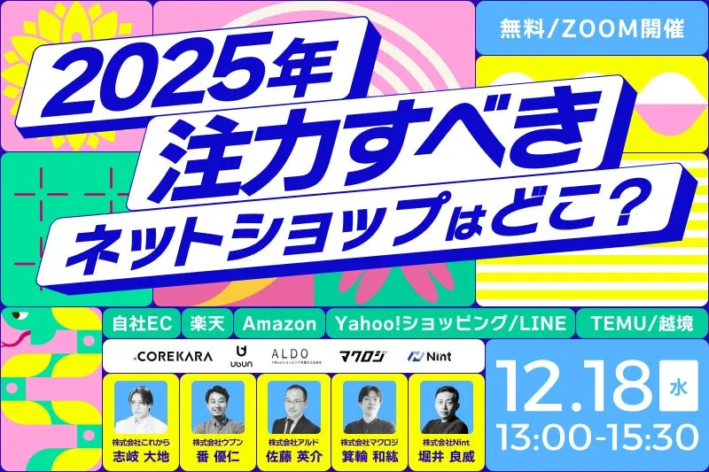 2024年12月18日水曜日、 EC事業者を対象とした無料オンラインセミナー「売上UPのスペシャリストが大集結! 2025年注力すべきネットショップはどこ?」が開催される。主催は株式会社これから、そして株式会社ウブンを含む数社が登壇し、参加者に向けて最先端のマーケティング戦略を伝える。