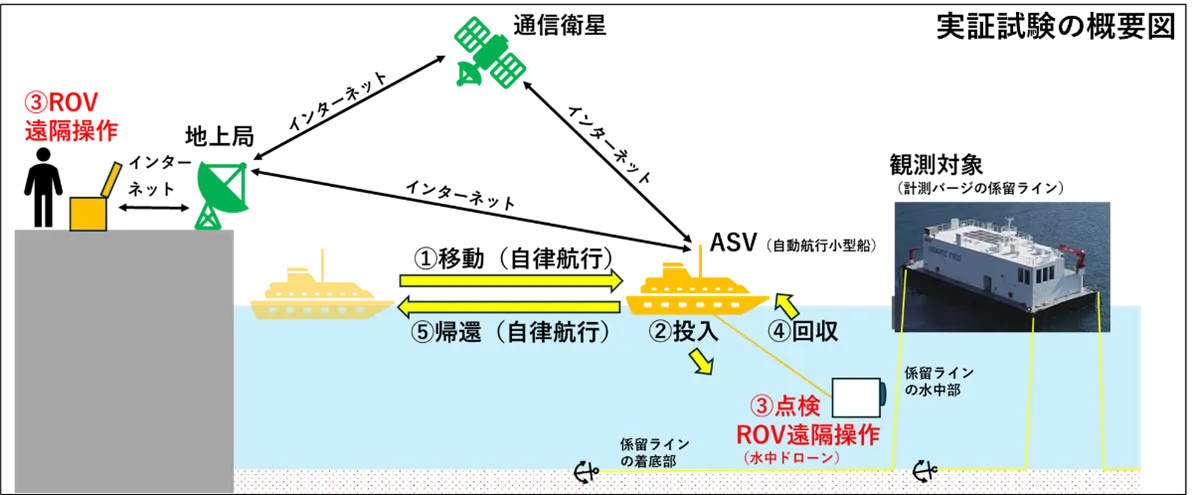 今回のプロジェクトでは、実証試験を通じて、海における無人機(ASV*1)と無人潜水機(ROV*2)を組み合わせたデータ取得の技術的な有効性を確認します。ASVは水面を移動し、ROVは水中を探索する機能を持っています。これにより、浮体式洋上風力発電設備を対象にしたデータ収集を行い、その成果をもとにAUVなどの無人探査機の社会実装に向けた技術的な課題を抽出します。