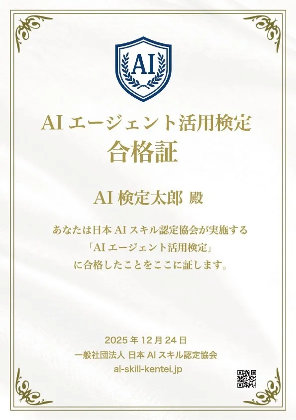一般社団法人日本AIスキル認定協会が、待望のAI資格「AIエージェント活用検定」を2026年1月16日より開始します。この資格は、業務を自律的に進行するAIエージェントを「設計・活用・管理」するための基礎知識を証明する、完全無料のオンライン試験です。