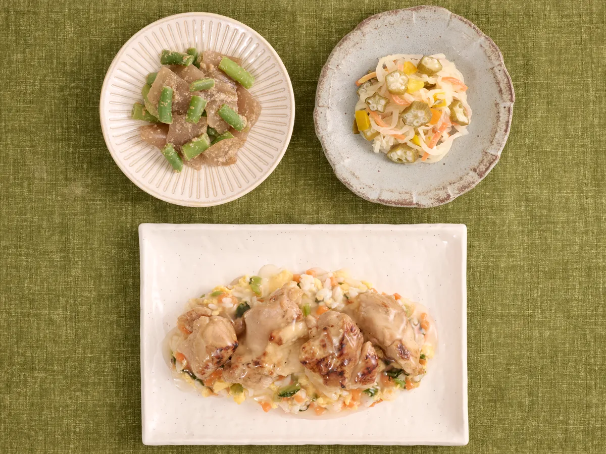 特に受験生が疲れている日の夕食や、夜食として理想的です。加えて、野沢菜やにんじんなどの野菜もふんだんに使用されているため、ヘルシーさと食べ応えを両立。副菜には、シャキシャキのインゲンとぷるぷるのこんにゃくを使用したごまだれ和えと、甘酸っぱく仕上げたオクラと大根のさっぱりサラダを揃えています。