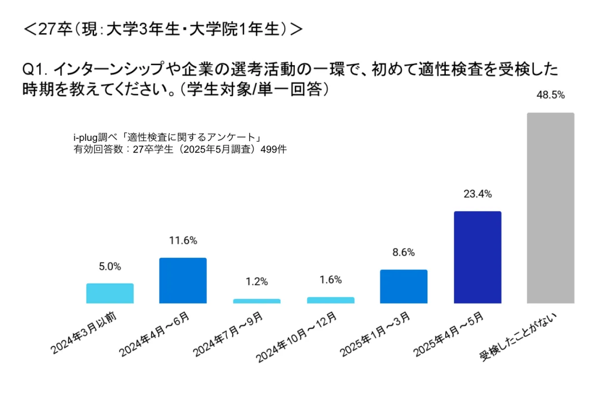 調査によると、26卒学生の82.0%が大学3年生までに適性検査を経験しています。特に、2025年1月から3月に初めて受けたという回答が最も多く、具体的には22.7%でした。一方、27卒学生の48.5%は、まだ適性検査を受けていないと回答し、今後のインターンシップなどで受検する可能性があると考えられます。