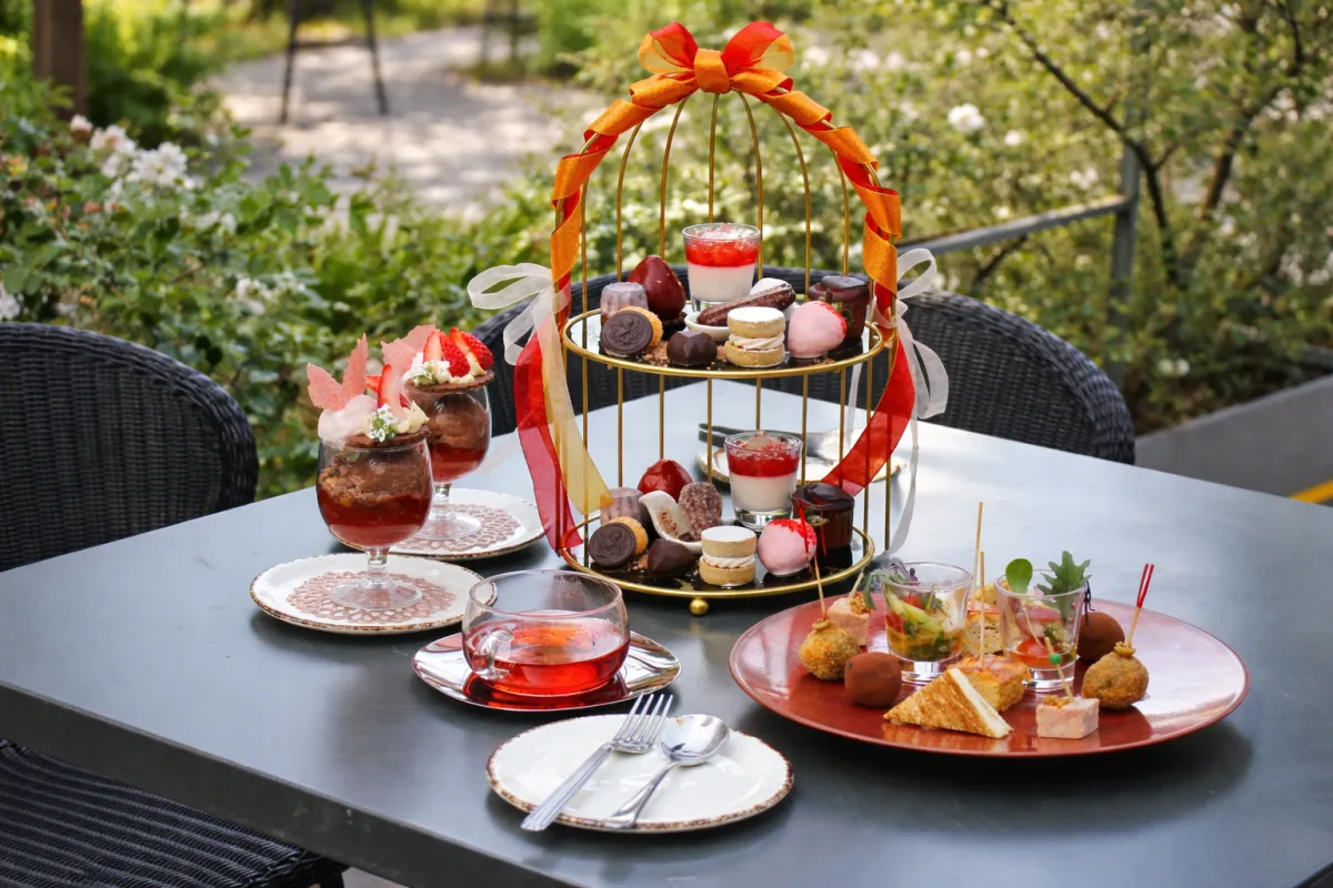 このアフタヌーンティーは、2026年2月から提供を開始し、多くのお客様に愛されてきたメニューです。運河沿いの美しいロケーションで、まるでスペインを体感しているかのような贅沢な時間を楽しむことができます。特に、真っ赤なリボンが印象的なティースタンドには、パティシエが手掛けたこだわりのスイーツと、本格的なセイボリーが絶妙に盛り付けられています。