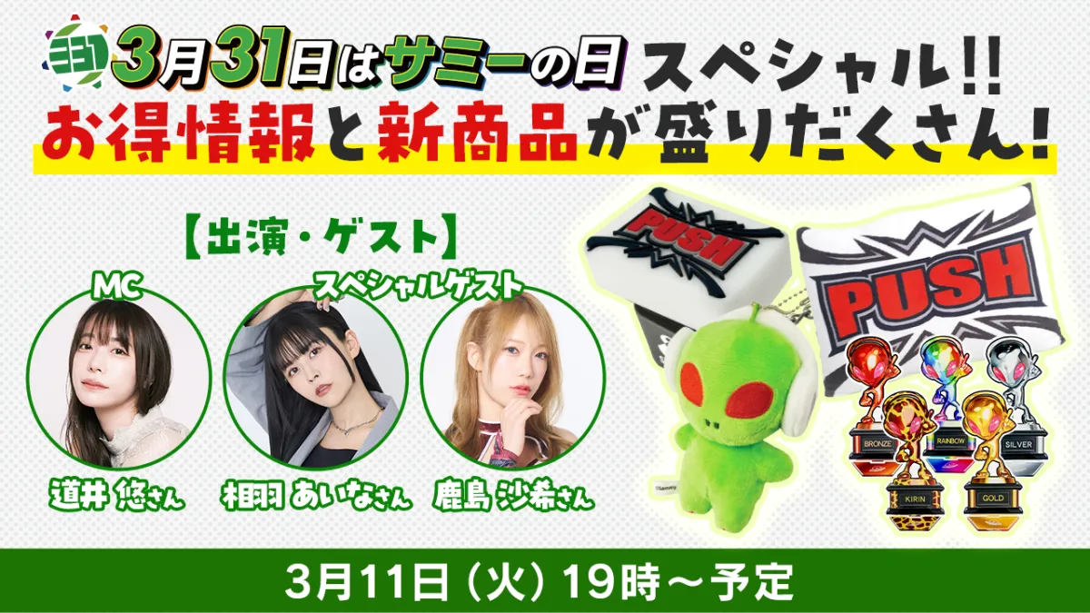 配信中には、新商品の紹介に加え、視聴者へのプレゼント企画も実施されます。生配信ならではのインタラクティブなゲームやミッションをクリアすることで、サミー商店オンラインの商品に使用できるクーポンやプレゼントがもらえるチャンスも用意されています。このようにユーザー参加型の要素が加わることで、更に楽しめる内容となっています。