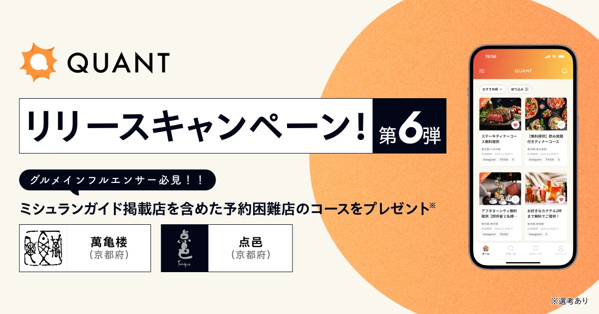 グリーエックス株式会社(以下、グリーエックス)は、新サービス「QUANT for Shops」のリリースを祝して、ミシュランガイドに掲載された有名飲食店へのインフルエンサー招待キャンペーン第6弾を開催することを発表しました。本キャンペーンは、飲食業界のDX化を加速させるための取り組みの一環です。