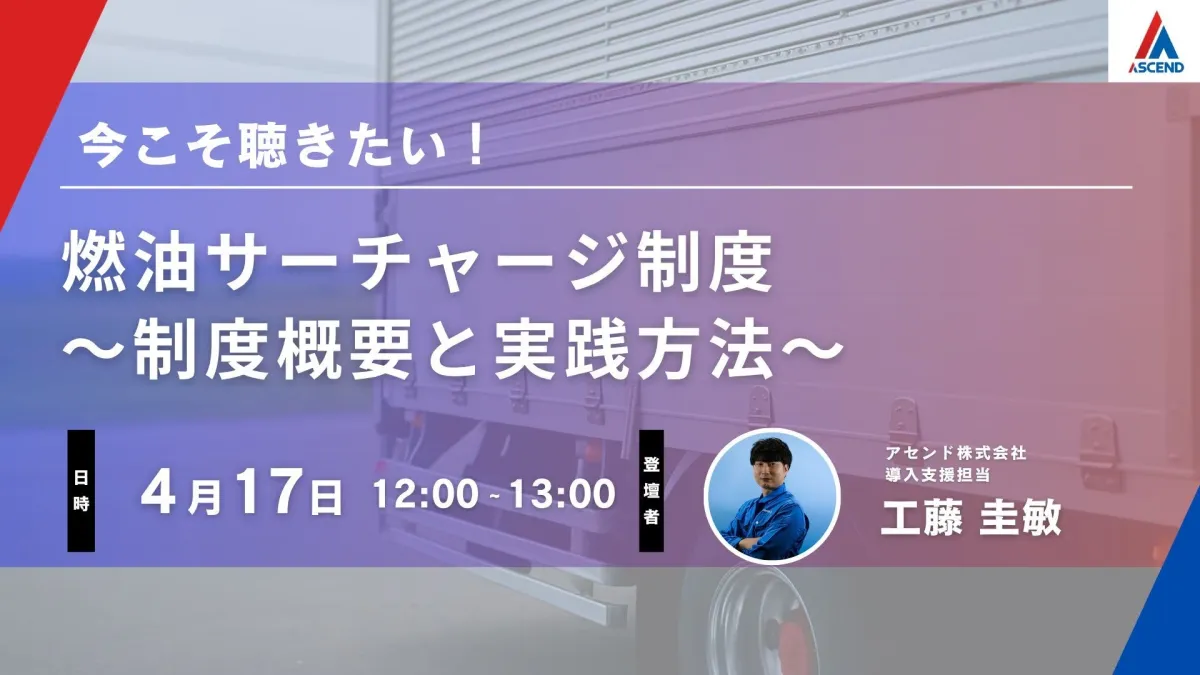 アセンド株式会社は、2026年4月17日(金)に運送業界を対象とした無料オンラインセミナー「今こそ聴きたい!燃油サーチャージ制度〜制度概要と実践方法〜」を開催します。今回のセミナーは、燃料価格の変動が続く中、運送業者が直面する課題を解決するための情報提供を目的としています。