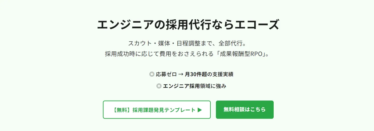 現在、エコーズは自社の採用課題特定に役立つ無料資料の提供や、個別相談を受け付けています。この機会に、貴社のエンジニア採用戦略を見直し、未来に向けた強固な採用基盤を築く一歩を踏み出してみてはいかがでしょうか。