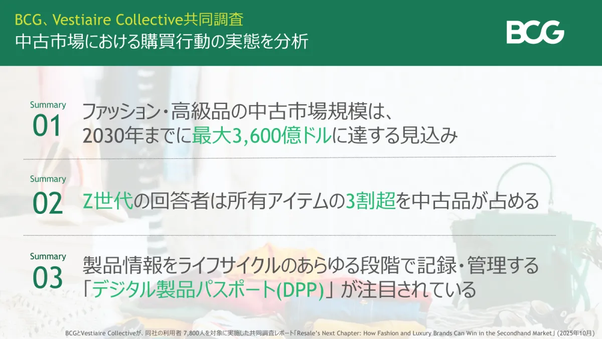 ファッションや高級品の中古市場は、持続可能性や個性的なスタイルを求める消費者の期待を背景に、今後ますます成長する見込みです。ボストン コンサルティング グループ(BCG)とVestiaire Collectiveが発表した調査レポート「Resale’s Next Chapter」によれば、この市場の規模は2030年にはおよそ3,600億ドルに達するとされています。