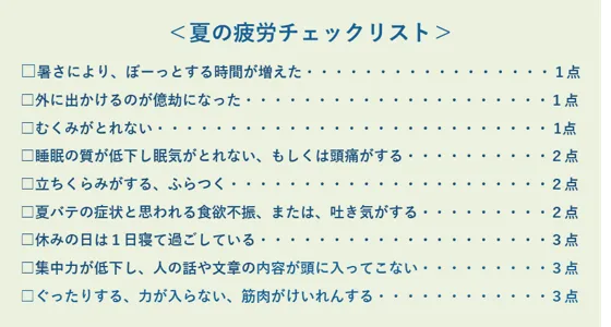 中富 康仁先生が監修した「夏の疲労チェックリスト」も発表され、このリストは軽度の不調から危険な状態までを示しています。多くの人が日常的に感じる「外出意欲の低下」や「ぼーっとする」といった不調が浮かび上がり、注意が必要です。