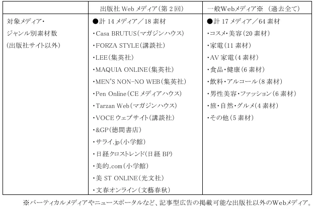 サンプル数は各400件で設定され、出版社Webメディア及び一般Webメディアのタイアップ広告が調査対象となる。これにより、広告主や出版社が持つメディアの有効性を相対的に評価することができる。調査の結果は、広告主へのフィードバックを行い、またセミナーなどを通じて公表される予定だ。