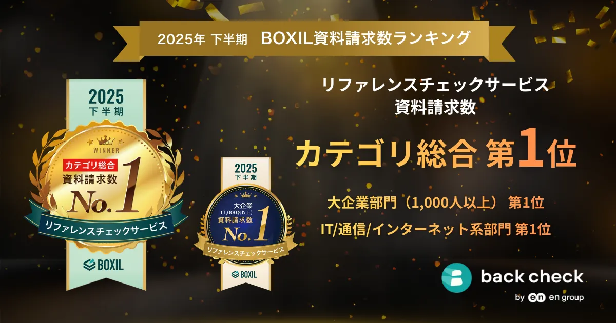 オンライン完結型のリファレンスチェック及びコンプライアンスチェックサービスを提供するback check株式会社の『back check』が、スマートキャンプ株式会社主催の「2025年下半期 BOXIL資料請求数ランキング」において、リファレンスチェックサービスカテゴリで総合1位に選定されました。その上、このサービスは大企業部門(従業員1,000人以上)及びIT/通信/インターネット系部門でも1位を獲得し、その実力を証明しました。