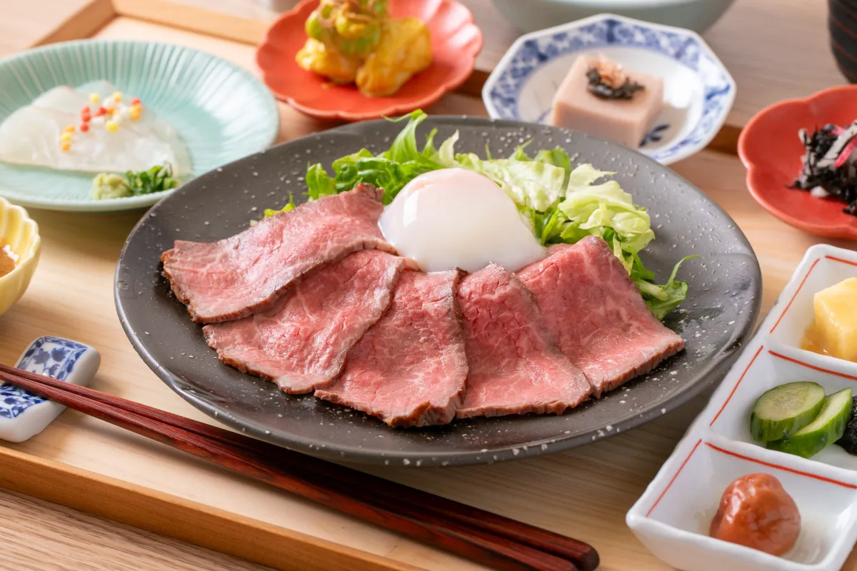 和牛ロースのローストビーフ: 山わさびしょうゆで味わう、贅沢なローストビーフ。