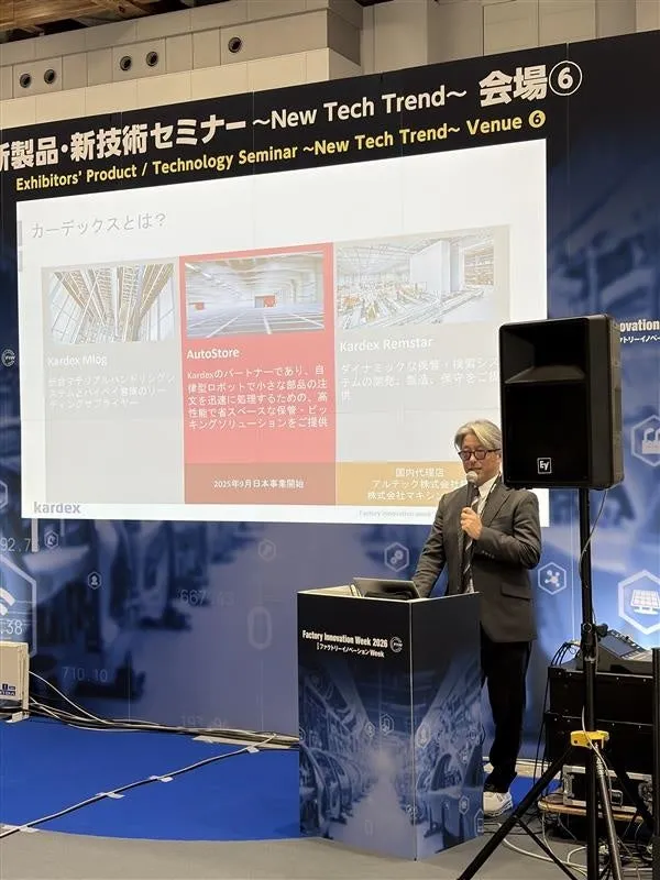 Kardexのブースでは製品の実物展示は行われず、運用イメージを伝えるデモ動画が中心の展示となりました。また、同セミナーにも多くの人々が参加し、工場の自動化に対する関心が高まっていることが実感できる場でした。来場者の声の中には、「初期投資を抑えながら自動化を始めたい」、あるいは「将来的な拡張を前提に段階的に導入したい」といった日本特有のニーズが多く見受けられました。