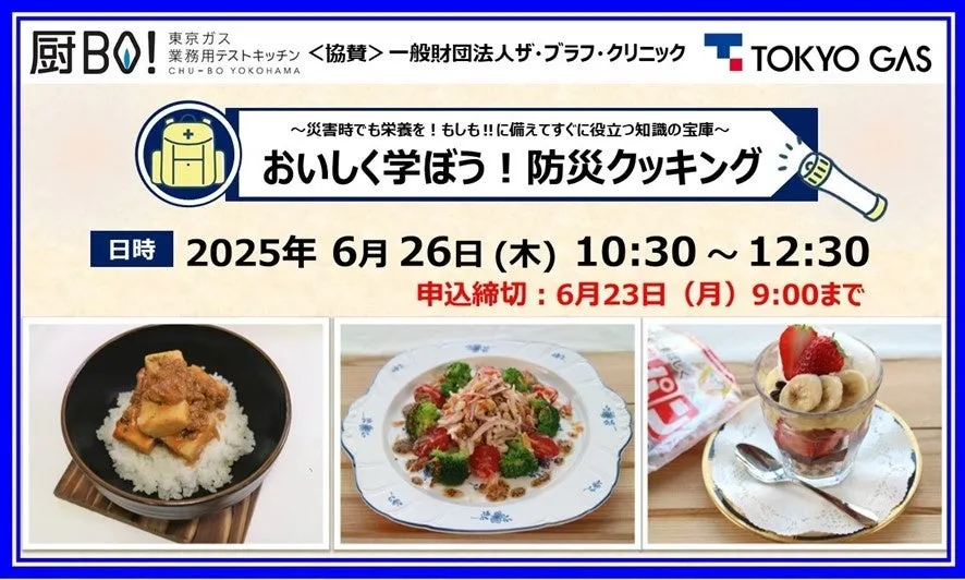 災害が発生した際に役立つ知識を得ることができ、さらにその知識を美味しく楽しむことができる料理教室が、横浜市にある東京ガス業務用テストキッチン「厨BO!YOKOHAMA」で開催されます。この教室の名は「おいしく学ぼう!防災クッキング」。