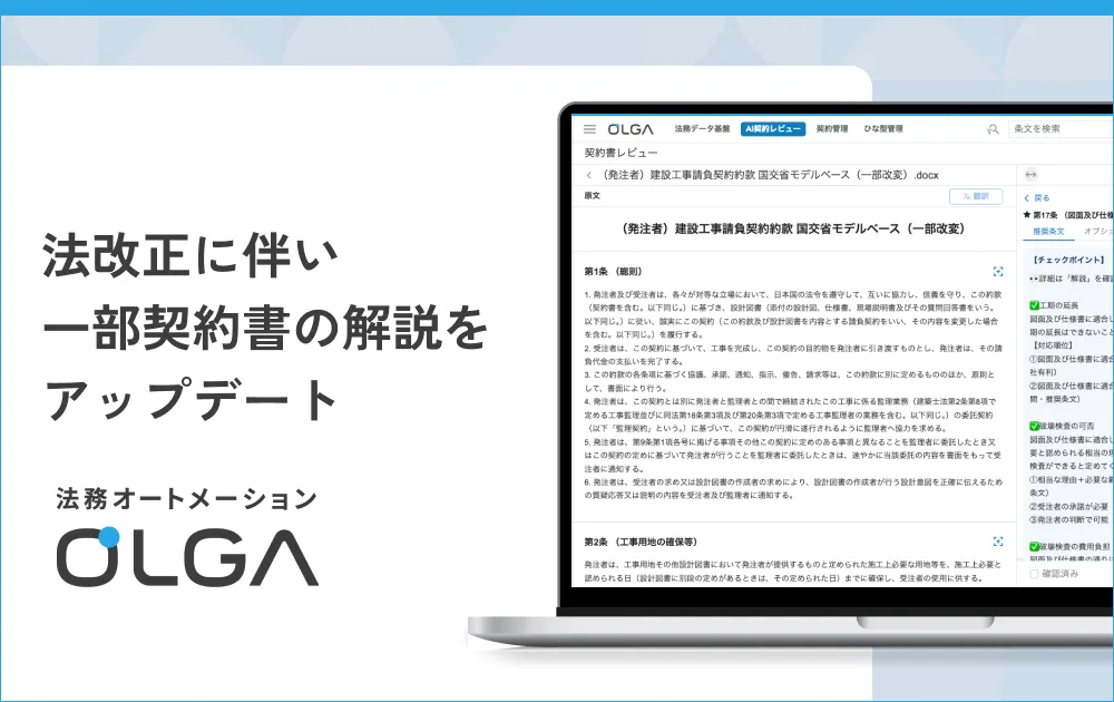 GVA TECH株式会社が提供する法務オートメーション「OLGA」は、法改正に対応し、建設工事関連や産業廃棄物に関する契約書の解説をアップデートしました。このアップデートは、最近の官公庁のモデル契約書や関連法令の改正に従ったもので、契約書レビューに必要な情報が一層充実しています。