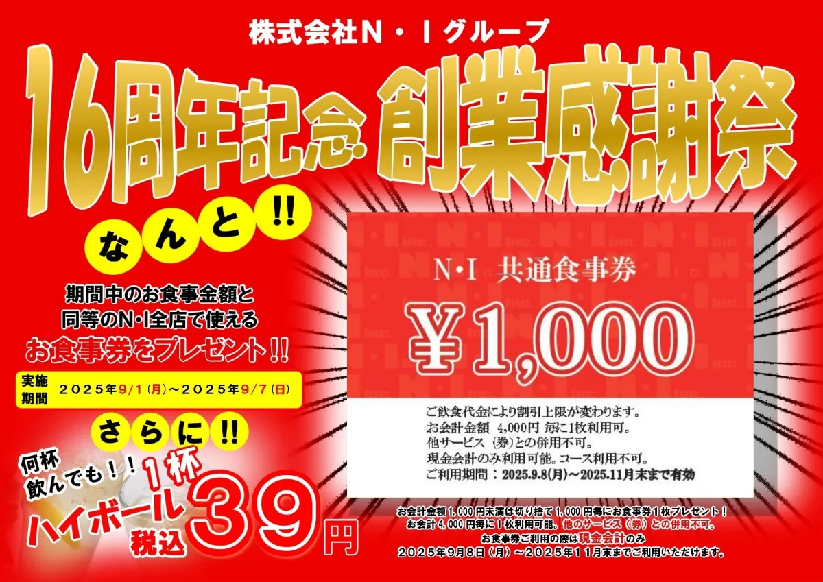 株式会社N・Iは、2025年9月に創業16周年を迎えるにあたり、感謝の気持ちを込めた特別なキャンペーンを実施します。このキャンペーンは、2025年9月1日から9月7日の7日間限定で行われ、N・Iが運営する10店舗でのご利用が対象となります。