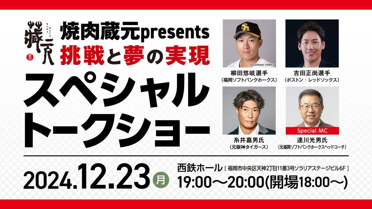 福岡市中央区にある「焼肉 蔵元」が2024年12月23日、特別なトークショーを開催します。今回のイベントでは、福岡ソフトバンクホークスのスター選手・柳田悠岐選手、ボストン・レッドソックスで活躍する吉田正尚選手、元阪神タイガースの糸井嘉男氏が登場します。また、スペシャルMCには達川光男氏を迎えて、華やかなひとときを提供いたします。
