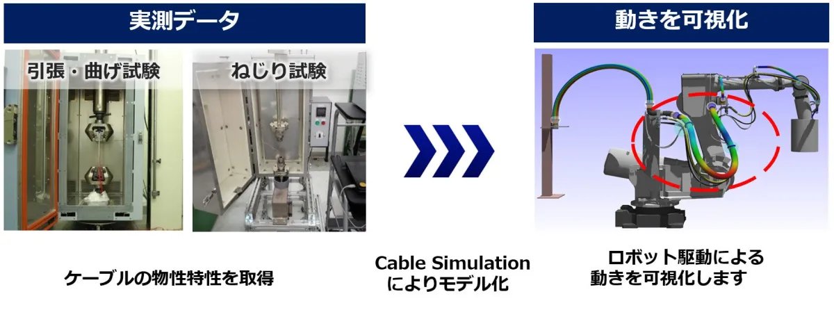 産業用ロボットは、多軸での動作を行うため、ケーブルやホースには複雑な応力がかかります。繰り返しの引張や曲げ、ねじりによる影響を正しく設計段階で考慮しないと、断線や被覆割れ、ホース破損など、多くのトラブルを引き起こし、最終的には装置の停止やメンテナンスコストの増加を招くことになります。このような背景から、物性値に基づくケーブル・ホースのシミュレーションが重要とされています。単なる形状情報だけではなく、引張剛性や曲げ剛性、ねじり剛性といった物性特性も正確に把握する必要があります。