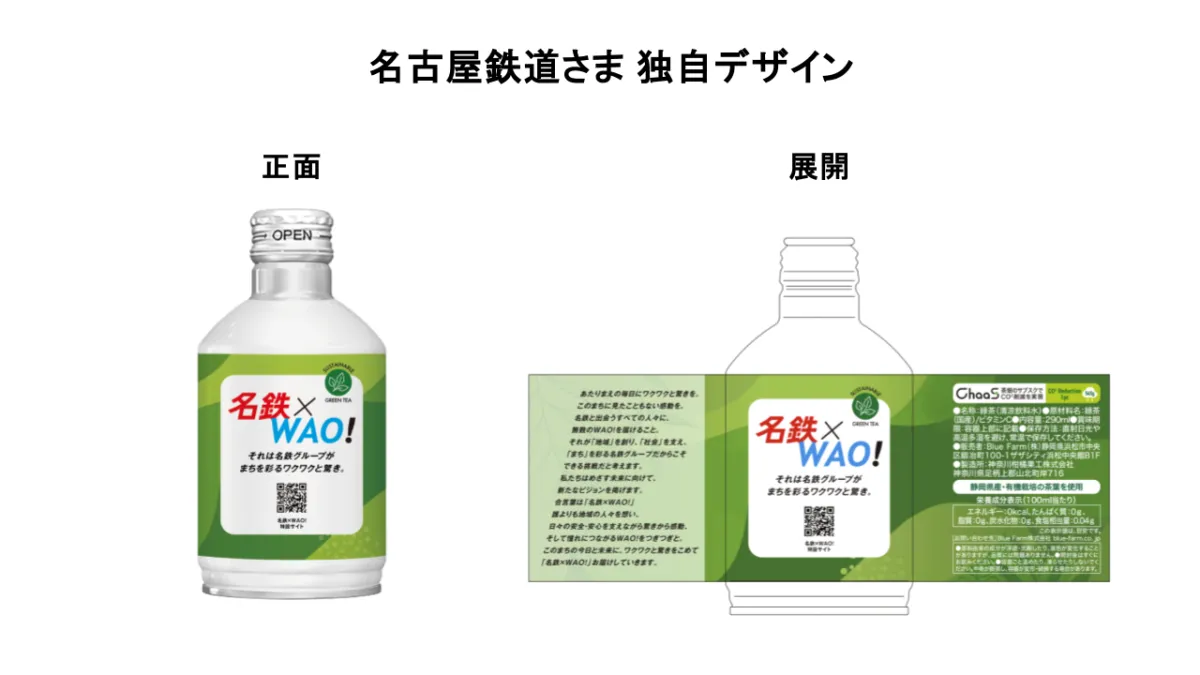 名古屋鉄道とBlue Farmの共同制作による緑茶飲料は、環境意識を促すために特別にデザインされています。「名鉄×WAO!」のスローガンを象徴するロゴが施されており、自然との共生をテーマにしたモチーフも取り入れられています。この飲料を通じて、環境問題への関心を高めるきっかけとなることを期待しています。