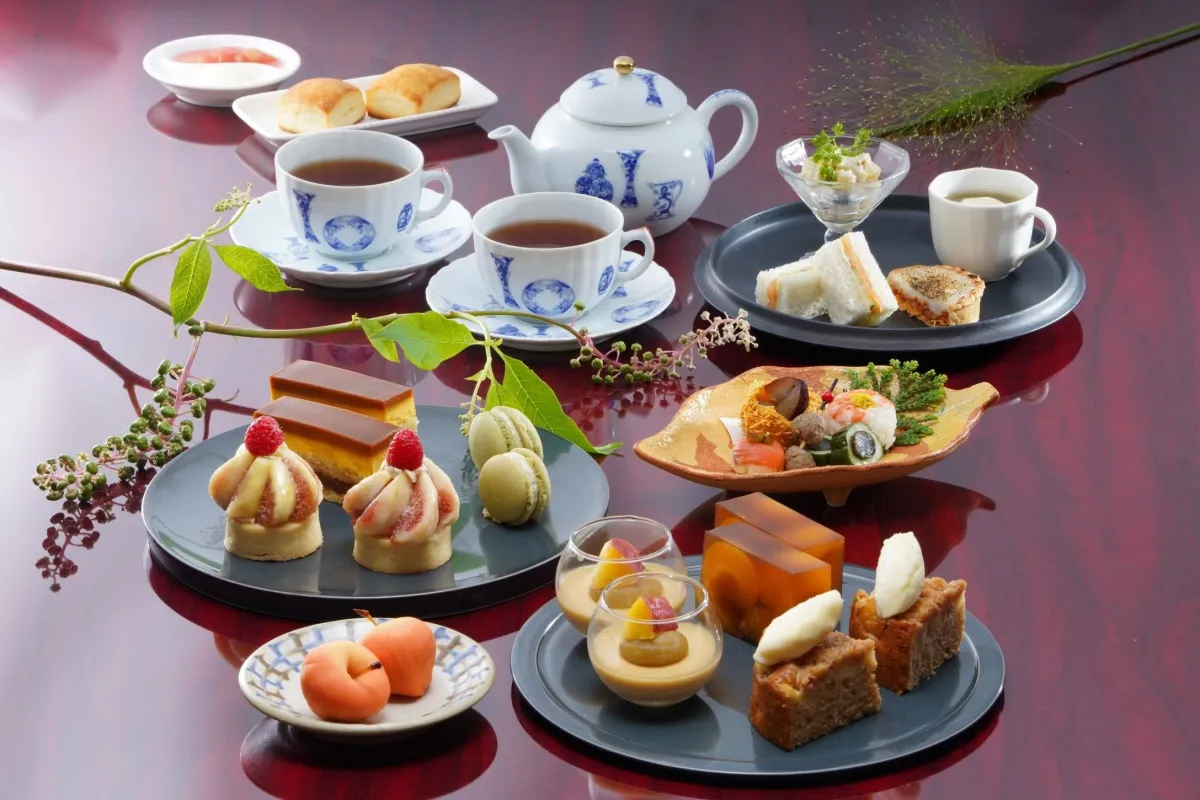 セイボリーのメニューも多彩で、アイルランドの「シェパーズパイ」や、秋の風情を感じる「菊花手毬寿司」など、一口ごとに秋の味覚が広がります。これらの品々は、目でも楽しめるよう丁寧に盛り付けられ、五感を刺激します。
