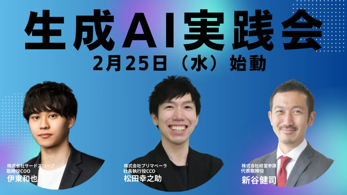 この実践会は、中小企業の成長を支援するために、松田幸之助氏と新谷健司氏が共同で主宰し、生成AI分野でのリーダー、伊東和成氏がアドバイザーとして参画します。各々が持つ専門知識と経験を活かし、参加者が生成AIをビジネスに取り入れる手助けをします。