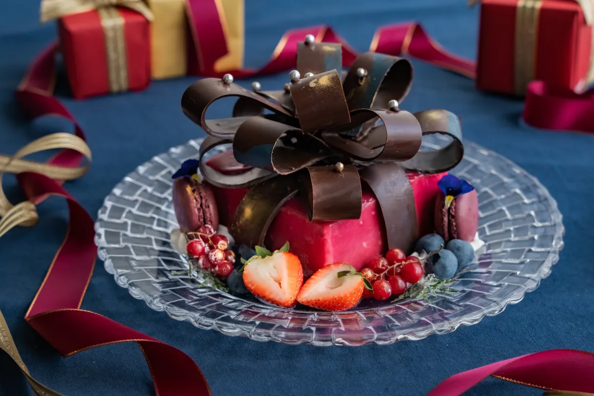この「プリザン・ノエル」は、ラズベリーとピスタチオの2層ムースが特徴で、見た目にも華やかなデザインになっており、シャンパンや紅茶とともに楽しむことができます。オーナーでありフレンチシェフが心を込めて作り上げたこのケーキは、クリスマスならではの華やいだ雰囲気を演出し、特別な時間を過ごすのに最適です。ケーキにはマカロンや新鮮なフルーツも添えられており、彩り豊かな一品に仕上がっています。