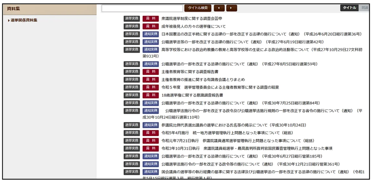 サービス内では、選挙管理に関連する判例や行政実例を詳しく解説しています。また、解説文には参照条文に基づく情報も表示されるため、必要な根拠を迅速に把握することができます。さらに、投開票事務や啓発活動などに関する国からの通知や調査資料も豊富に収録されており、ワンストップで確認可能です。