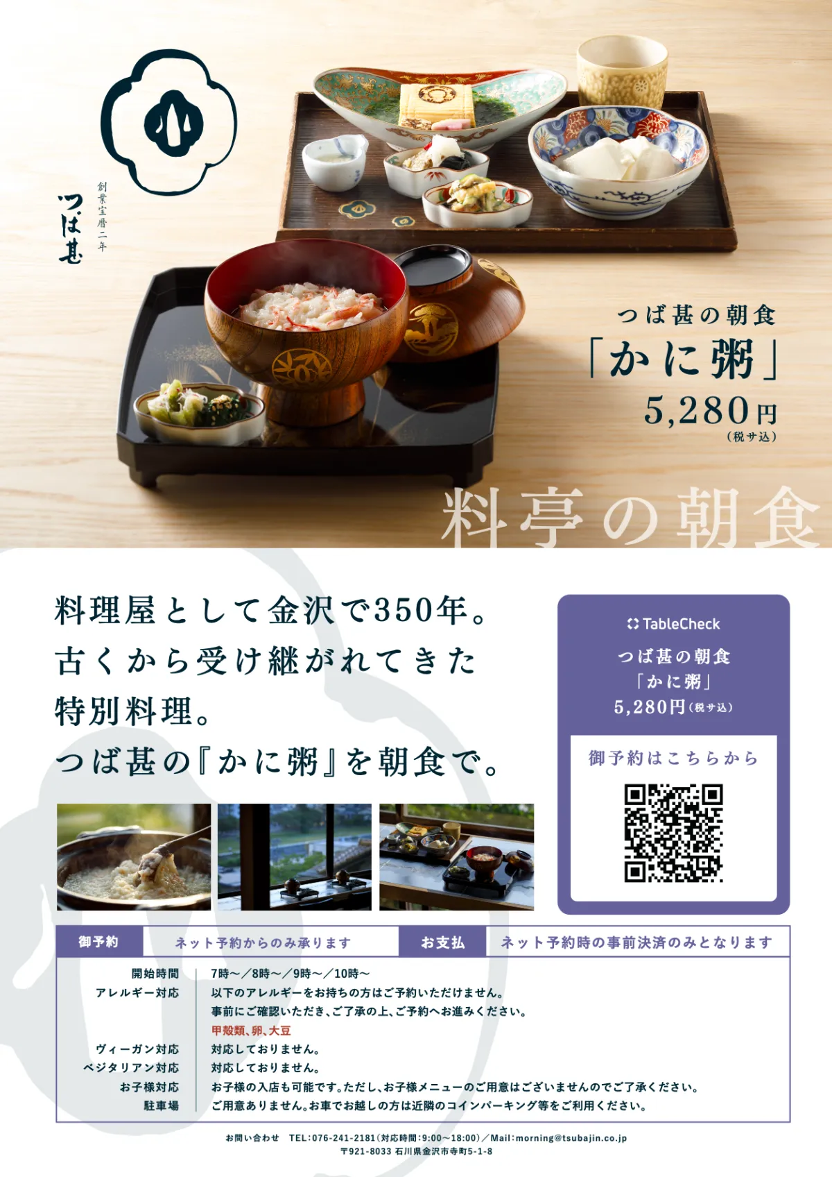 金沢市に位置する老舗料亭「つば甚」。その歴史はなんと350年に及びます。2025年7月1日より、この名店が新たに朝食メニューとして「かに粥」を提供することが決定しました。この新サービスは、地元の新鮮な食材をふんだんに利用し、風味豊かな出汁と蟹の旨味を最大限に引き出した料理です。季節に応じて異なる種類の蟹を楽しむことができるため、訪れるたびに新しい味覚を体験できるでしょう。