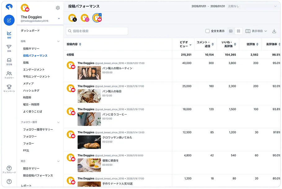 「SocialDog」は、X(Twitter)やInstagram、Facebookといった主要SNSの状況を一元管理できるオールインワンのSNSマーケティングツールです。今回のアップデートでは、YouTubeチャンネルのパフォーマンスも加わり、運用がさらに便利になりました。特に、チャンネルの動画再生回数や各種エンゲージメントを確認できる機能が追加されています。