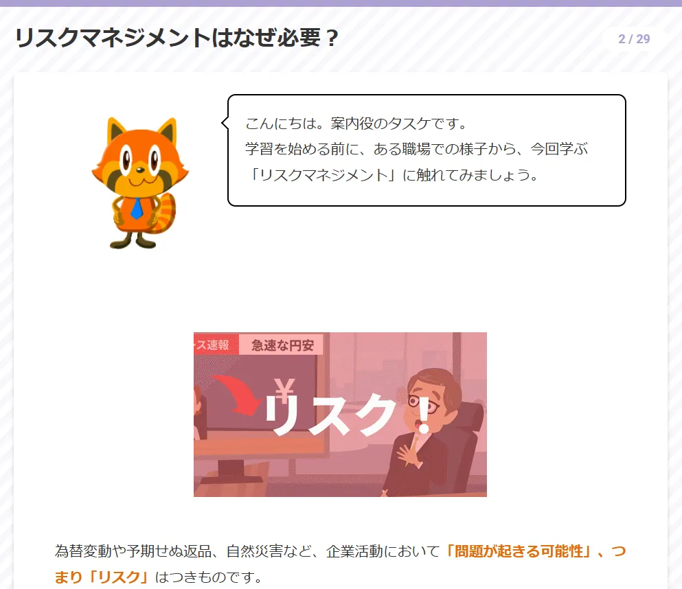 この教材は国際標準規格であるISO31000(JIS Q31000)に基づいており、理論だけでなく、具体的な事例やアニメーション、図解を使ってわかりやすく教えてくれます。また、実務に合わせたケーススタディも行われるので、学んだ知識を業務に即座に適用できる点が特徴です。