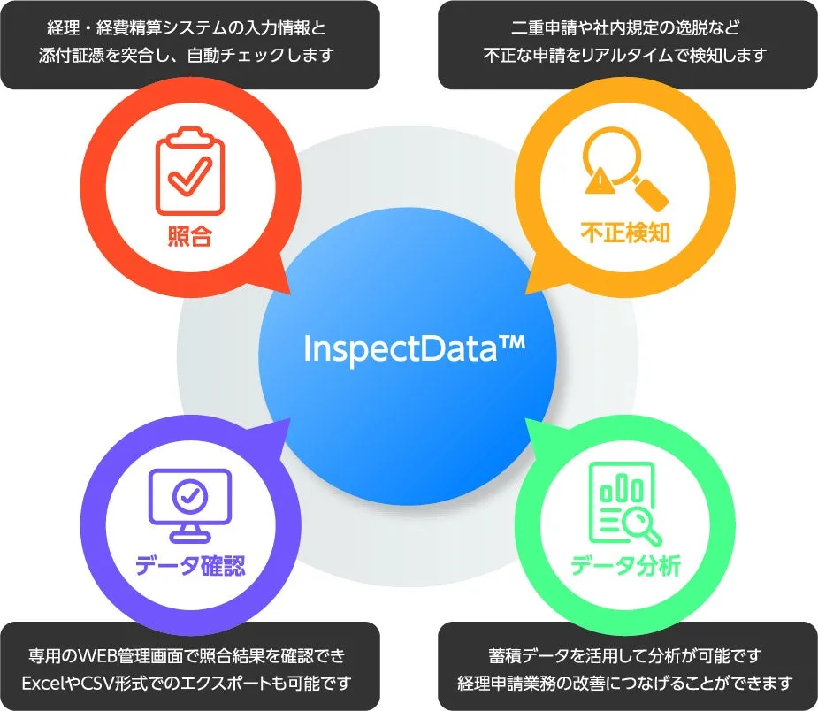 『InspectData』は、生成AIやAI-OCRを用いて申請内容や添付証憑を自動的に照合し、確認業務を簡素化します。申請内容の取得はAPIやRPAを用いて柔軟に対応し、既存の業務フローに組み込みやすい設計となっています。また、企業のルールに従った運用設計も可能です。