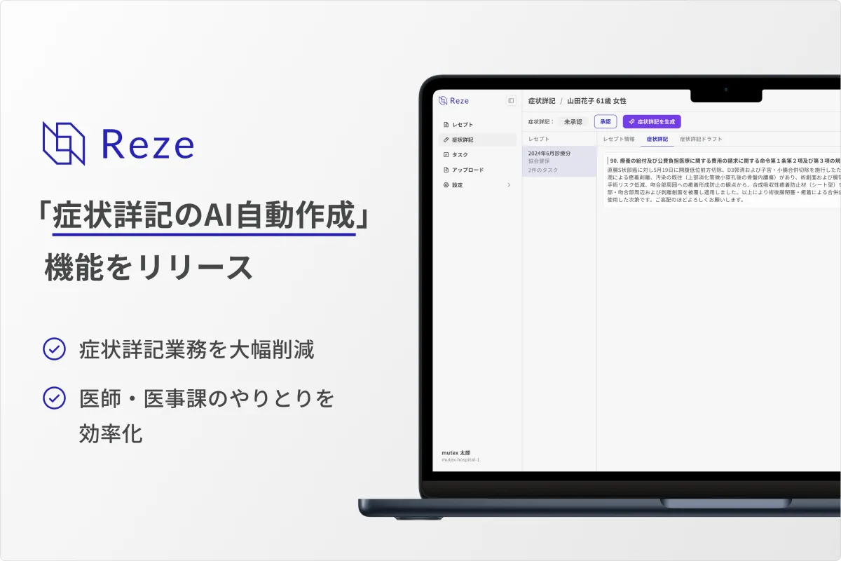 株式会社mutexが手掛ける医療機関向けのAIレセプト管理ソフトウェア『Reze(レゼ)』が新しい機能をリリースしました。この機能は、「症状詳記」を自動生成するAI技術を活用したもので、医療現場における業務の効率化を図ります。