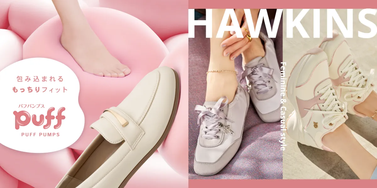 「HAWKINS」からは、フェミニンとカジュアルを絶妙に組み合わせた「フェミカジスニーカー」が新登場。ヒールアップや厚底、ロープロスタイルなど、多彩なデザインが展開されています。フォーマルなシーンでもカジュアルな装いでも、きちんと感を兼ね備えたデザインは、抜け感を持たせつつも高級感を漂わせます。春のお出かけにぴったりのこのシューズたちは、軽やかな季節の装いを足元からさりげなくアップデートしてくれます。