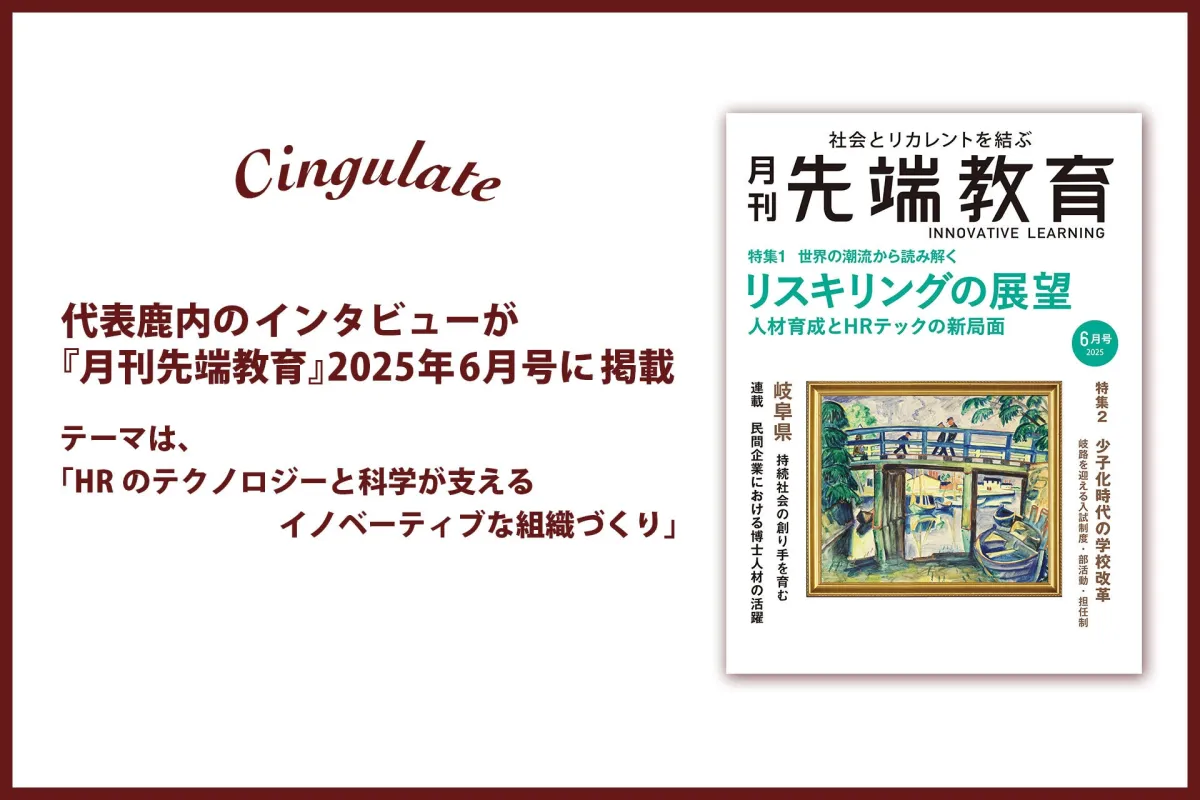 株式会社シンギュレイトの代表、鹿内学博士のインタビューが、教育専門誌『月刊先端教育』の2025年6月号に掲載されました。この号では、HR(人事)テクノロジーと科学を基盤にしたイノベーティブな組織作りについて深く掘り下げています。日本企業が直面する現代の課題と、その解決策を模索する様子をお伝えします。