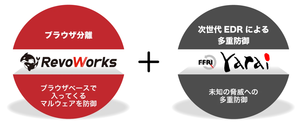 近年、ブラウザを活用したフィッシング攻撃やゼロデイ攻撃が増加しています。そのため、従来のエンドポイントプロテクション(EPP)だけでは、これらの新たな脅威に対して十分な防御ができないことが多くなっています。そこで、インターネット分離ソリューション「RevoWorks」と、FFRIが提供する先進的なEDR製品「FFRI yarai」を組み合わせることで、より多層的な防御を実現しています。