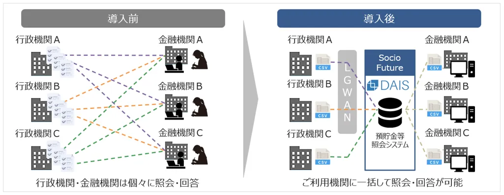 DAISが生まれた背景には、行政機関と金融機関の事務負担を軽減する必要性がありました。従来、預貯金等の照会業務は非常に手間が多く、多くの職員の負担になっていましたが、DAISはこの業務を電子化し、一括で処理できる仕組みを提供しました。この変革によって、お客様からは業務効率だけでなく、業務そのものの改革が評価されています。
