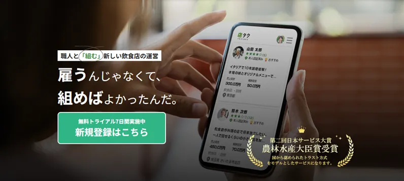 このような経営者のニーズに応える形で、株式会社ムジャキフーズが開発したマッチングサービス「店タク」が2020年に開始されました。店舗と優れた料理人とのマッチングをサポートし、業務委託の柔軟性を提供しています。このサービスは高い評価を受け、日本サービス大賞(農林水産大臣賞)を受賞しました。