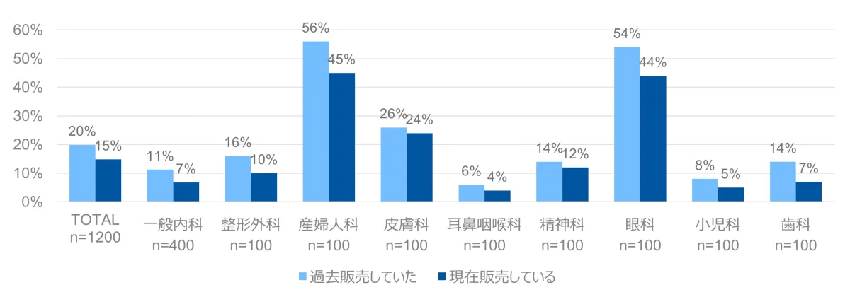 調査の結果、クリニックで最も多く販売されている物品はサプリメントで、特に「産婦人科」と「眼科」での販売割合が約5割と高いことがわかりました。具体的には、一般内科、整形外科、皮膚科、小児科など、9つの診療科において12種類の物品(サプリメントを含む)について調査を行ったところ、過去に販売した割合が全体で20%、現在販売している割合が15%と分析されました。
