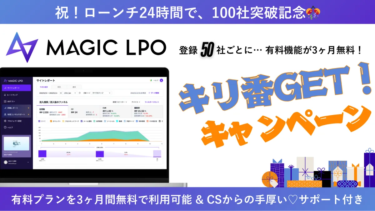 株式会社free web hopeが提供する新しいランディングページ(LP)改善ツール「MAGIC LPO」が、2026年1月20日のリリース後、わずか24時間で135社の登録者を達成したことをご報告します。この成果を記念して、同社は「キリ番GET!キャンペーン」を開始しています。
