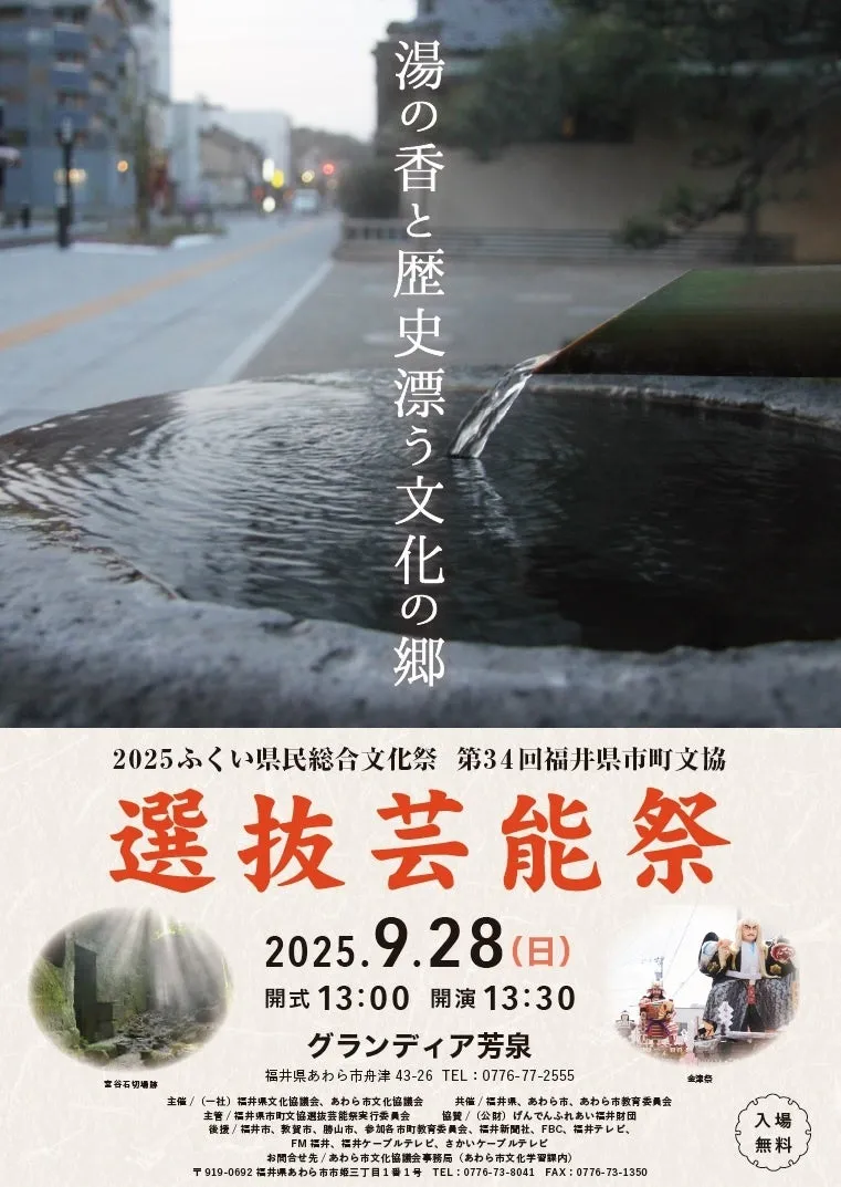 この地域に訪れ、選抜芸能祭を楽しむことで、あわら市の文化や魅力に触れる貴重な機会を得られることでしょう。ぜひ、この機会に福井の豊かな芸能文化を体験してください!