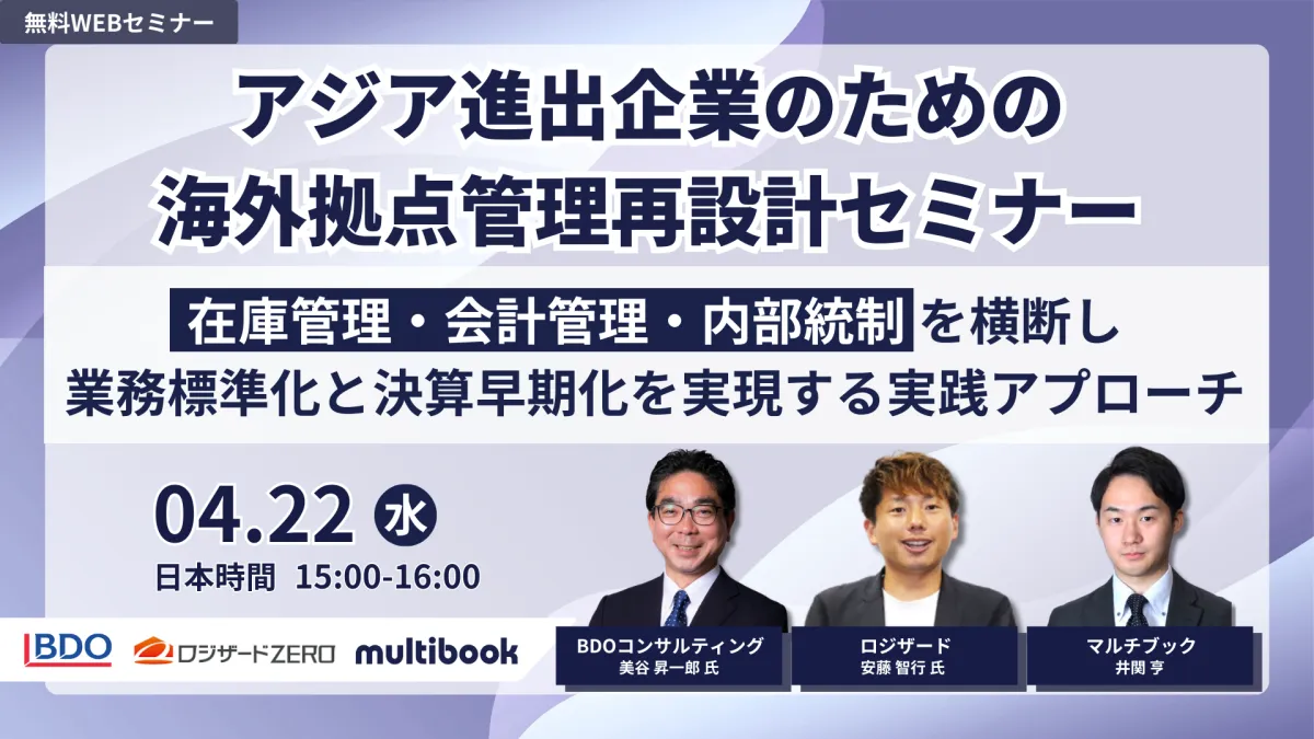 株式会社マルチブックとロジザード株式会社は、2026年4月22日(水)にWEBセミナー『アジア進出企業のための海外拠点管理再設計セミナー』を開催します。このセミナーでは、日系企業がアジアでの事業をさらに円滑に進めるための実践的なアプローチに迫ります。
