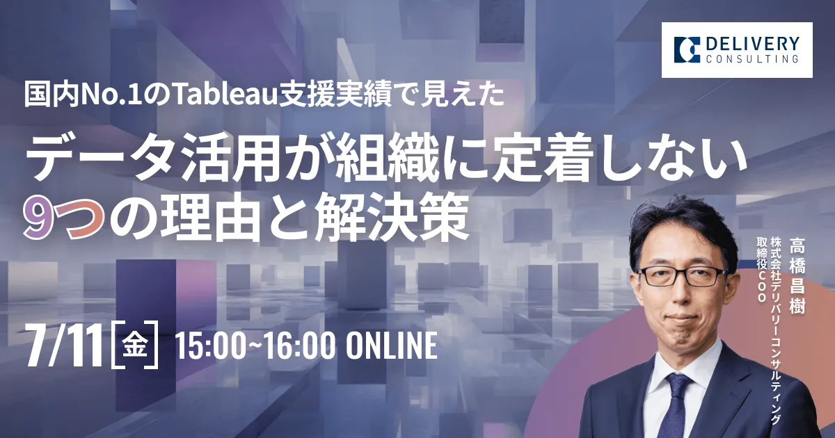 データ活用の重要性が叫ばれる中、企業のさまざまな現場でデータが十分に活用されていないという課題があります。そんな状況に一石を投じるべく、株式会社デリバリーコンサルティングが、無料のWEBセミナーを開催することが決定しました。テーマは「国内No.1のTableau支援実績で見えたーデータ活用が組織に定着しない9つの理由と解決策」。データリテラシーを高め、真のデータドリブンカンパニーを目指すグローバルビジネスの実現に向けて、データ活用の壁を乗り越えるためのヒントを提供します。